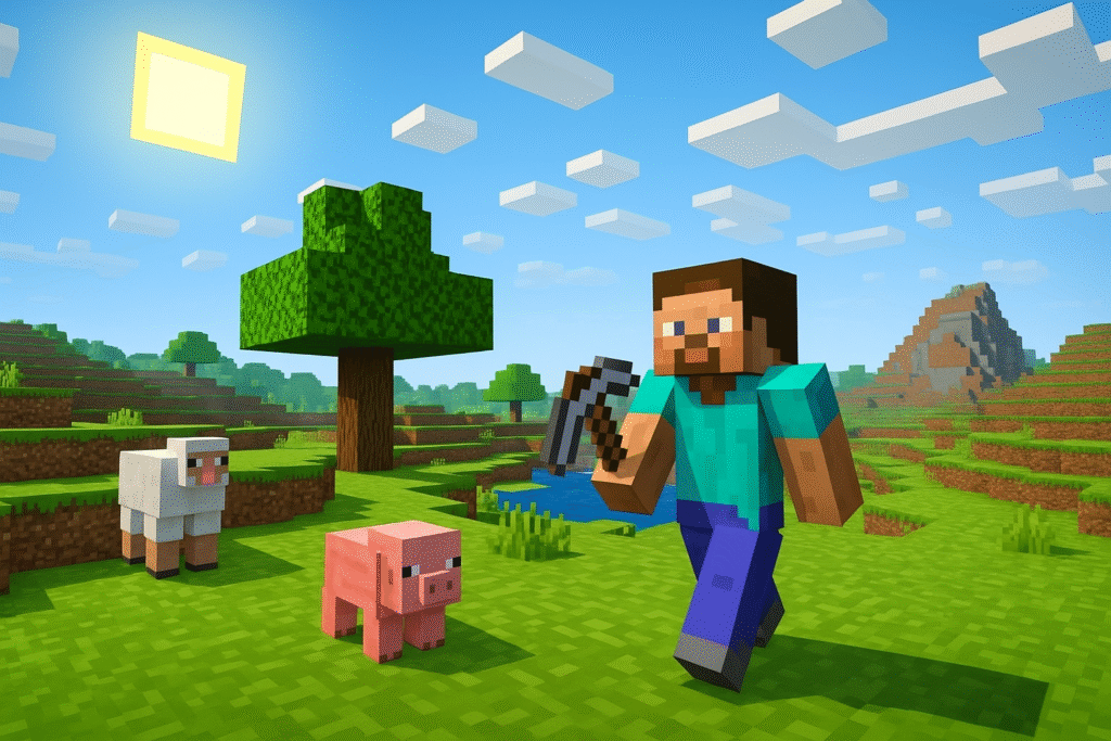 Minecraft in seiner ikonischen Blockwelt – ein echtes Phänomen, das auch in Deutschland Millionen Spieler fasziniert.